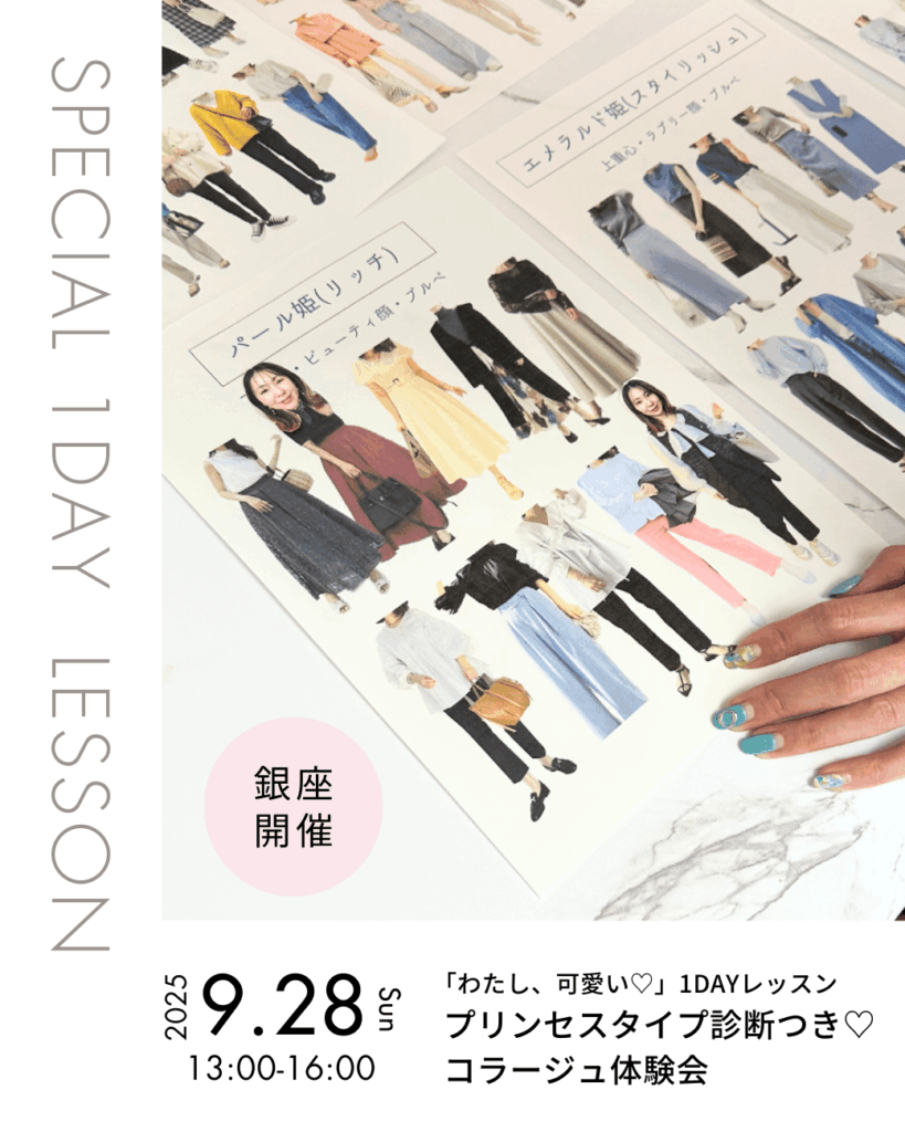 これは、似合う色・着痩せシルエット・全身の印象トータルで似合うがわかる、プリンセスタイプ診断で知ることができます。