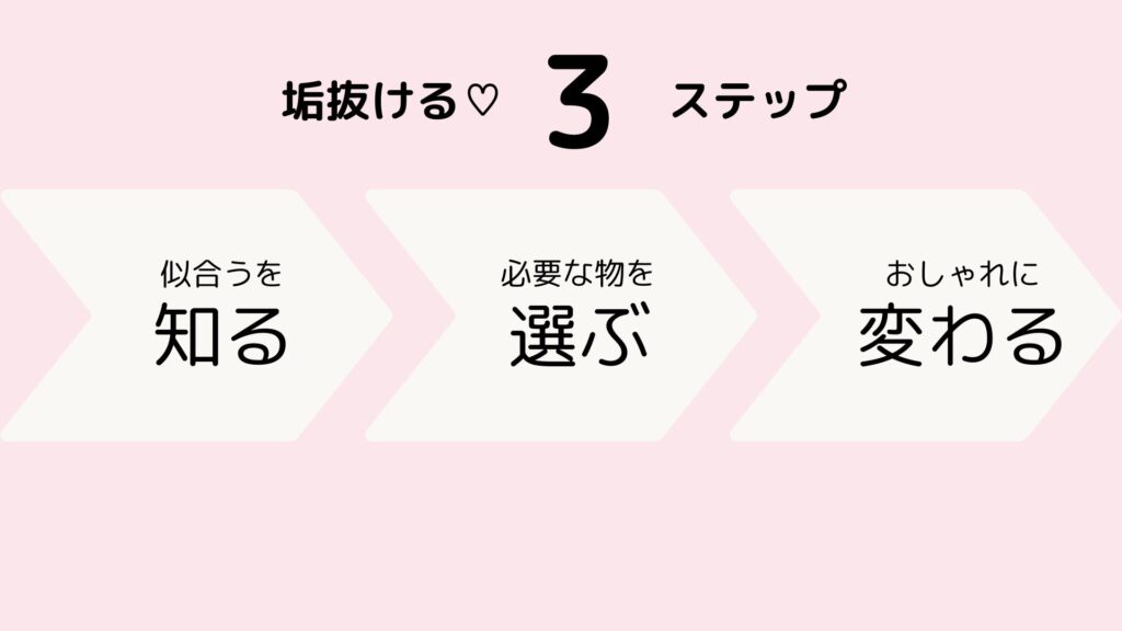 わかりやすいように、おしゃれのやり方(方程式)を3ステップで解説しますね。
